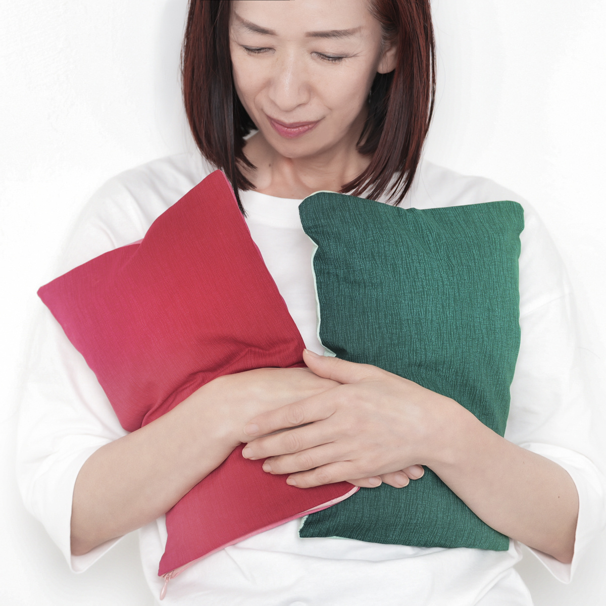 香りと抱き心地で、休む時間へすっと切り替わる能登ヒバ・リカバリークッション「綿妃愛」。能登ヒバチップ×天然コットンに特許ミネラルセラミック。蒼光/桃翠のリバーシブルで日常の切り替えを美しく支えます。