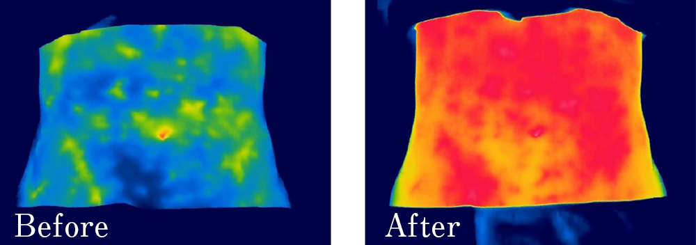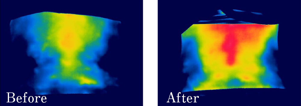 赤外線サーモグラフィを使って、このクッションがどのように体に作用するかを科学的に確かめてみました。