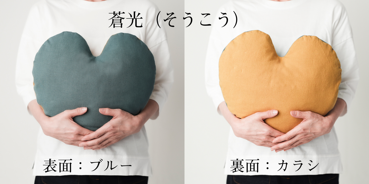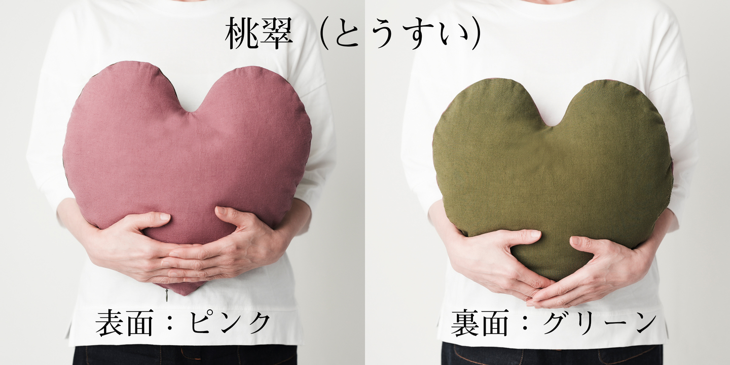 カバーはリバーシブルで、蒼光(ブルー×カラシ)と桃翠(ピンク×グリーン)の2種をご用意。裏返すたびに空間の印象が変わり、季節やインテリアを整える楽しみも。