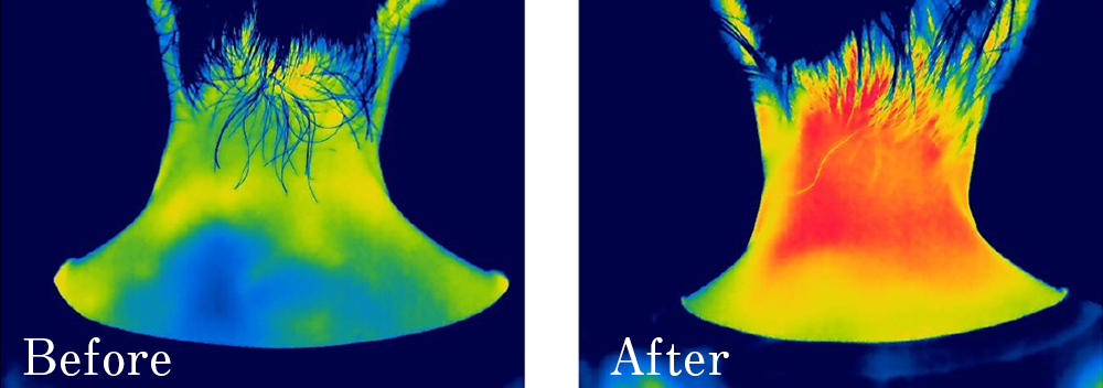 その結果、赤外線サーモグラフィ試験でも、首・手・腰・お腹に使用後、血流促進が数分以内に確認されました。